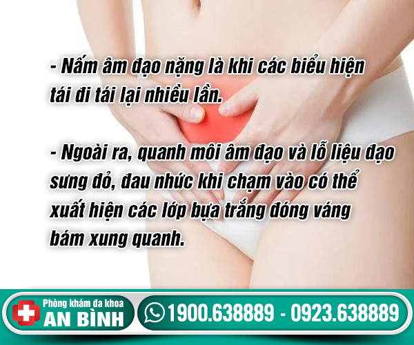 Nấm âm đạo nặng là khi các biểu hiện trên tái đi tái lại nhiều lần. Ngoài ra, khi ở giai đoạn nặng nhiều phụ nữ còn nhận thấy quanh môi âm đạo và lỗ liệu đạo sưng đỏ, đau nhức khi chạm vào, có thể xuất hiện các lớp bựa trắng đóng váng bám xung quanh.